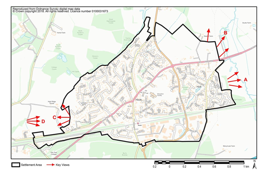 The development would harm the character, visual amenity and scenic quality of the landscape by urbanising a countryside location with the proposed houses. The figure below identifies key viewpoints from Hook that are defined in the Hook Neighbourhood Plan. The proposed development would destroy the views from C and considerably denigrate those from D (in the next diagram)